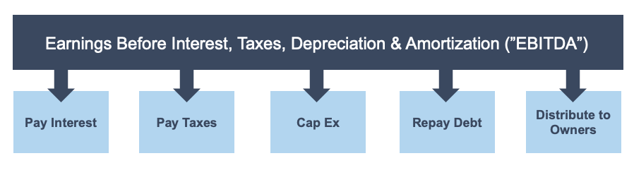 As illustrated below, EBITDA represents the cash flow available to fulfill a variety of corporate obligations, such as making interest and principal payments on borrowed funds, paying taxes, funding maintenance capital expenditures, and providing distributions to owners.