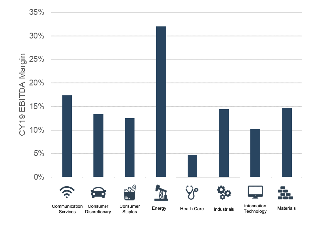 At a high level, industry provides a decent proxy for capital intensity. As shown below, industries that require large amounts of capital expenditures – like communications, energy, industrials, and materials – generate higher EBITDA margins than the other, less capital-intensive industries.