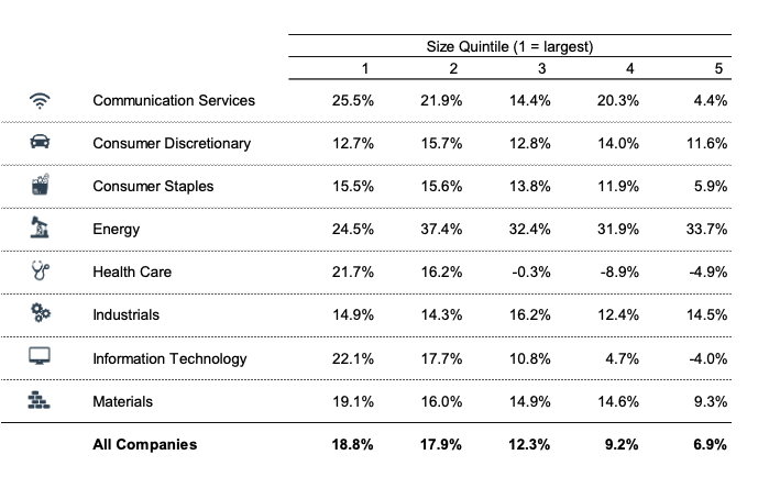 Economies of scale are real. As companies get larger – whether through acquisition or organic growth – the ability to gain operating efficiencies increases. As a result, it is common for larger companies in each industry to generate higher EBITDA margins than their smaller peers. The opportunity to achieve economies of scale undergirds many acquisition strategies. As shown in the following table, the median EBITDA margin for the largest companies in our dataset (18.8%) exceeded that for the smallest (6.9%) by nearly twelve percentage points.