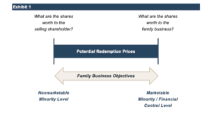 A shareholder redemption is a purchase by the family business of shares from a family shareholder. As with our corporate development and divestiture examples from last week’s post, shareholder redemptions reflect an inherent tension between buyers and sellers, as illustrated in Exhibit 1.